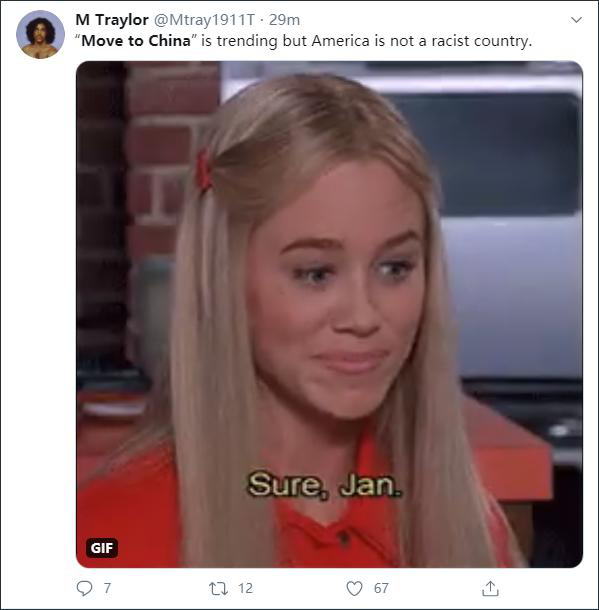 一个网民讽刺道,“‘搬去中国’都上热搜了,还说美国不是一个种族主义国家。”