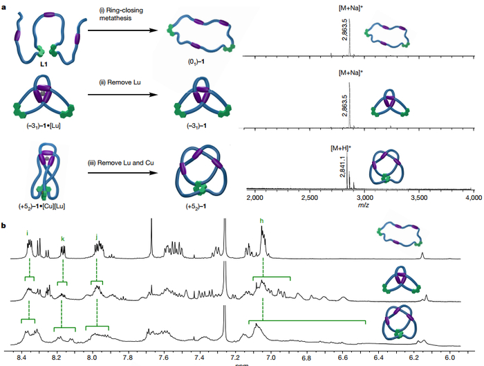 分子结52的合成由四步制备得到。首先配体L1与Cu(I)配位高效率地形成两种金属络合物(ΛCu和ΔCu); 第二步,由于配体中点手性的诱导,只有其中的一种构型ΛCu络合物能够与三价镥离子形成开链的分子52结; 第三步,通过烯烃复分解锁定开链结构得到金属分子52结; 第四,脱去两种金属离子制备得到有机分子52结。需要指出的是,分子结52的合成不受热力学控制,不同的金属离子添加顺序会产生不同的结果。实验结果表明,仅在先添加Cu (I)然后添加Lu (III)的条件下可以得到正确折叠的主要中间体(ΛCu,ΛLu)-L1•[Lu] [Cu]。研究人员通过核磁共振氢谱证实了1•[Cu] [Lu]的合成,同时圆二色谱(CD)的信号表明产物的拓扑结构和立体构型是(+52)–1•[Cu][Lu]。