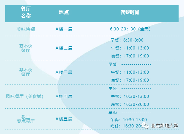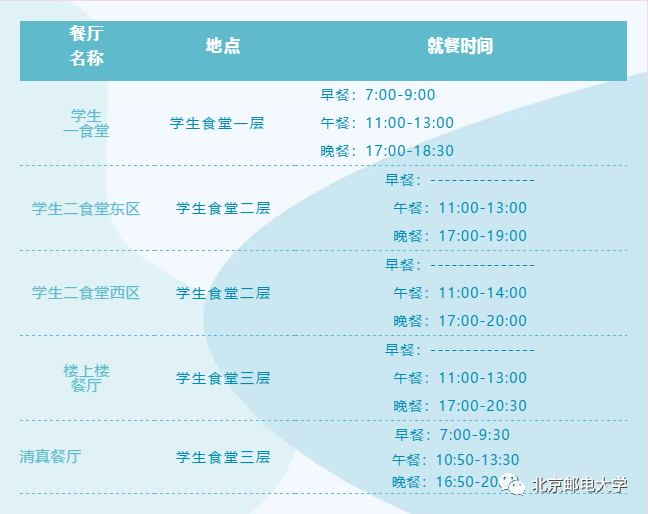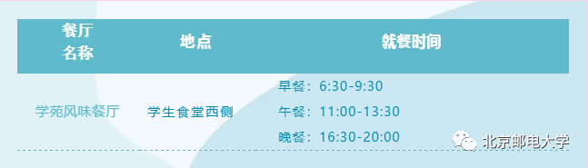 5、食堂适当延长供餐时间,西土城校区风味餐厅、沙河校区美食汇、美味快餐全天营业,工作日中午 11:30-12:30 容易出现就餐高峰,请分时段错峰就餐。