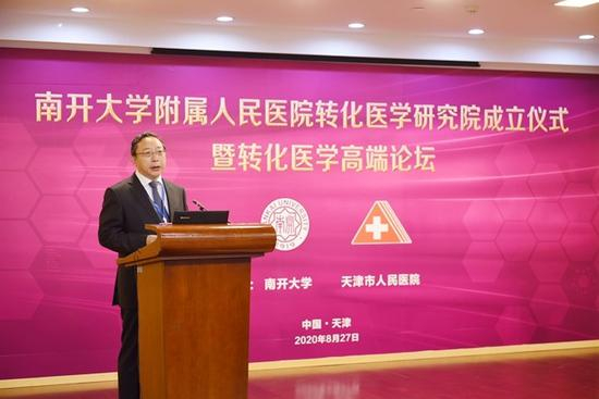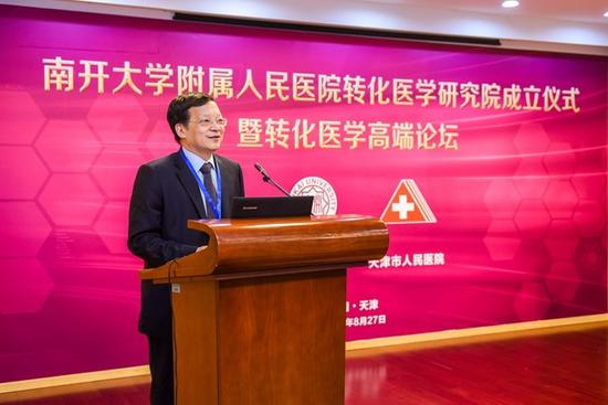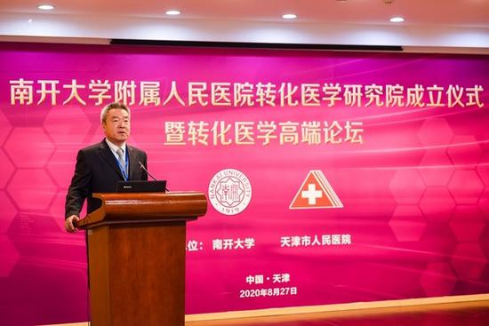 曹雪涛在致辞中代表南开大学对各位院士和专家学者表示热烈欢迎。他说,新冠疫情的暴发使我们更加深刻地认识到国民健康是国家可持续发展能力的重要标志。加强与天津医科大学和天津市有关医院的合作,着力发展医学学科,是南开大学面向国家需求,在新百年中加快推进“4211卓越南开行动计划”生医发展计划的重要战略部署。南开大学附属人民医院转化医学研究院的成立,将充分发挥南开大学基础宽厚的科研优势和天津市人民医院的医疗资源优势,共同开展高水平的医学研究,促进基础研究成果快速转向临床应用,助力提高天津医疗水平,服务健康中国战略。