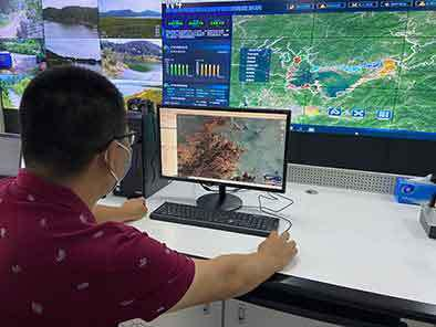 ▲8月21日拍摄的北京市密云水库综合执法大队密云水库智能化指挥管理调度系统的大屏幕前,工作人员正密切关注水库情况。新华每日电讯记者魏梦佳摄