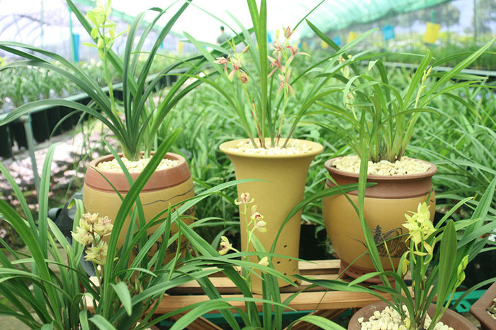 走进武义县王宅镇陶宅村方郁文的兰花基地,游客们都会被整齐摆在花架上众多数量和品种的兰花所吸引惊叹。虽然七八月份是兰花花开的淡季,但一盆盆秀美的枝叶中仍有不少探出了绿色、紫红色、鹅黄色等色彩不一的兰花,清雅悠远的花香,让人陶醉不已。