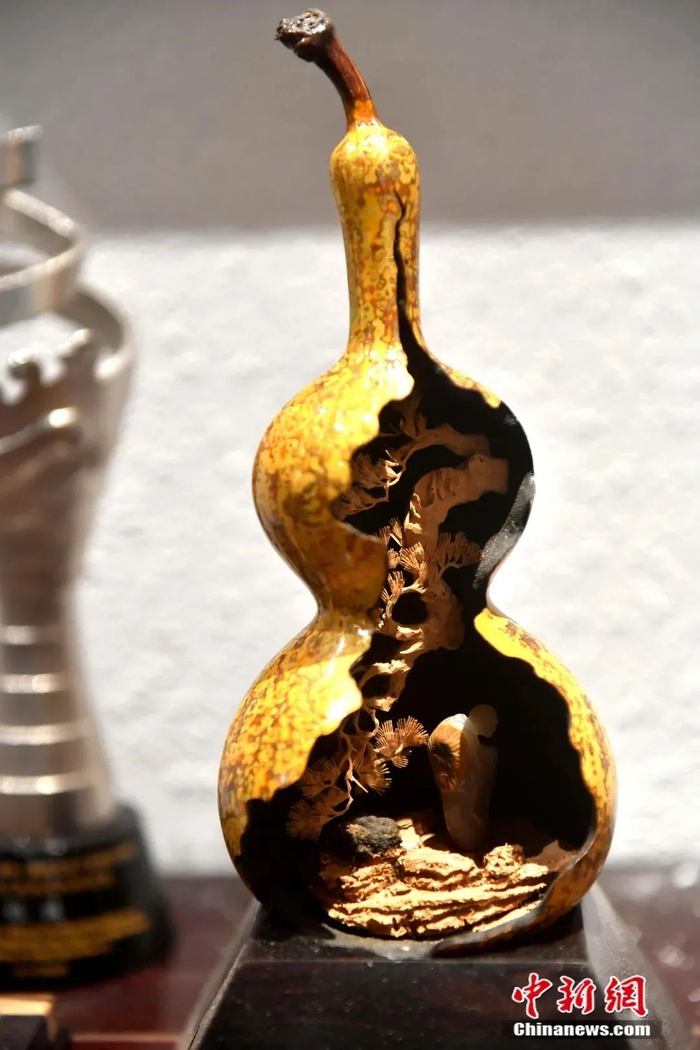 18道工序打磨出葫芦上的大漆祥云纹,荡舟的渔翁用的是寿山石雕,软木画擅长的题材松鹤仙人成为主角,这组壶中乾坤系列表示天上人间的意境。过去从未有过这样的造像和材质混搭,这组作品引发了业界的关注。