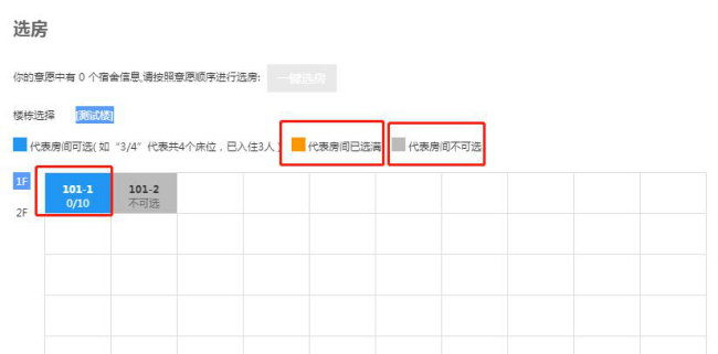 ③预览完成后可行预选房,点击进入后进入预选房页面,橙色表示房间已被选满,灰色表示房间不可选,蓝色表示可选房间。