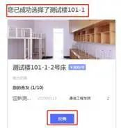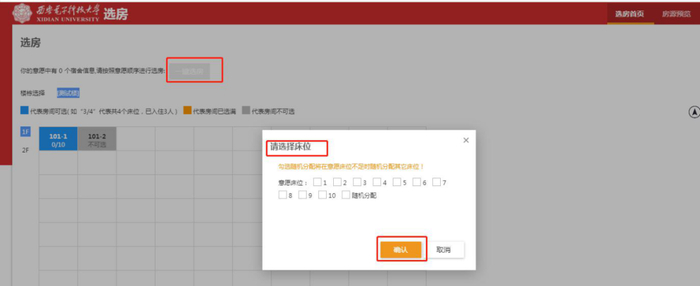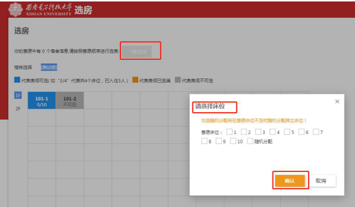 ④在可选房间里面点击意愿房间后勾选意愿床位,点击确认,完成预选房。也可以点击上方的“一键选房”按钮,系统会自动选择房源预览环节中加入的“意愿房间”。