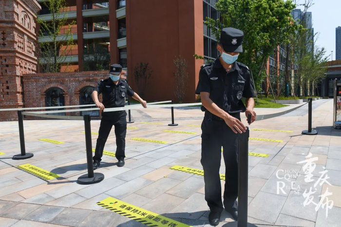 8月30日,重庆两江新区青禾童心小学校,安保人员设置好隔离带,迎接开学。邹乐 摄