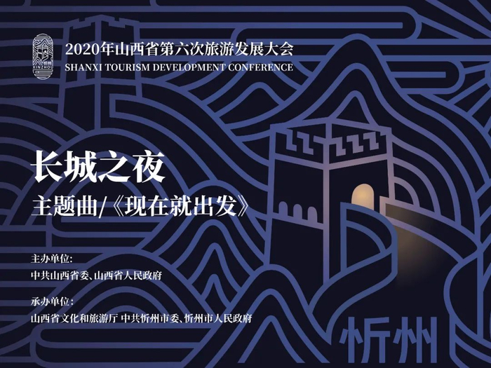 2020年山西省第六次旅发大会的海报,以稳重、朴实的古代山西传统颜色黑色为背景主色调,以长城为核心元素,呈现了绵延西来的万里长城,与奔腾东去的黄河水在山西相遇的图景,构思独特,是历史与现代的融合。首先,海报鲜明突出和强调了长城元素。山西是中国的长城大省,忻州又是山西的长城大市,忻州地界上的长城遍布十三个县(市、区),是山西省长城分布最广的地区。忻州境内的古长城还拥有数项“全国之最”:忻州长城的修筑历史纵贯战国至明朝10个朝代;现存较完好的明长城248公里、早期长城230公里,两项合计478公里。本次旅发大会着力推广山西、忻州的“长城游”,呈现长城六大内涵:游长城雄关、览烽火古堡、品红色长城、探黄河边城、听长城故事、悟长城内涵。我们的海报,正是以长城的烽火台为核心形象,凸显了长城在山西旅游中的重要位置,同时也呼应了本次大会的主题“华夏古文明、山西好风光——长城博览在山西”。其次,忻州恰好是长城和黄河握手的地方。我们可以看到,在海报的画面中,长城和黄河在烽火台处相聚,给人以强烈的视觉冲击。长城和黄河所形成的轨迹,如同一条文旅新路,象征着忻州向世界发出邀请,传达出山西开放的讯号。