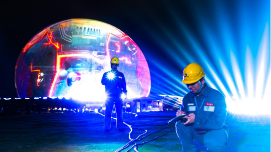 图为南方电网广东珠海供电局运维人员在珠海地标建筑物——珠海大剧院的灯光秀现场开展保供电工作。