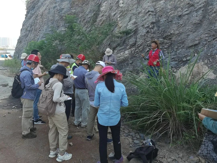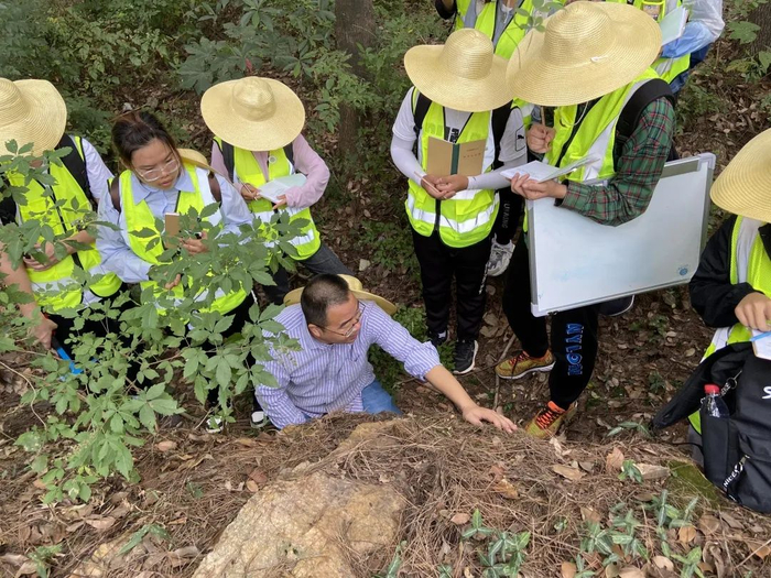 葛文老师带领031185班同学观察山体岩石结构和构造(唐伟摄)