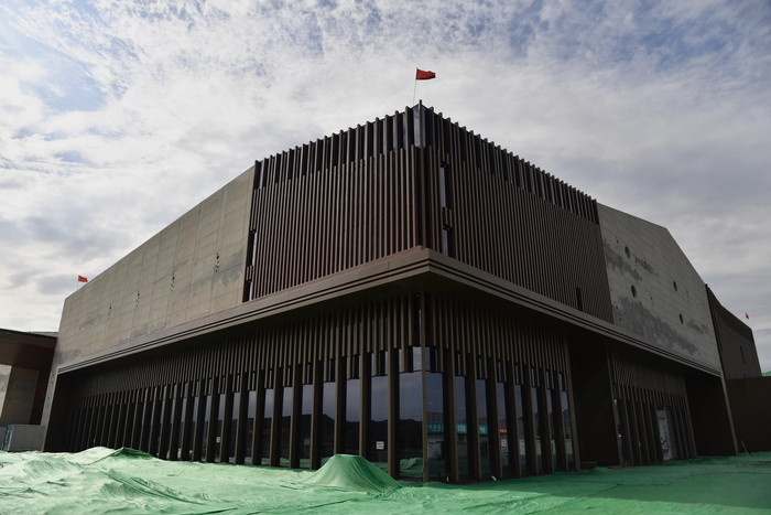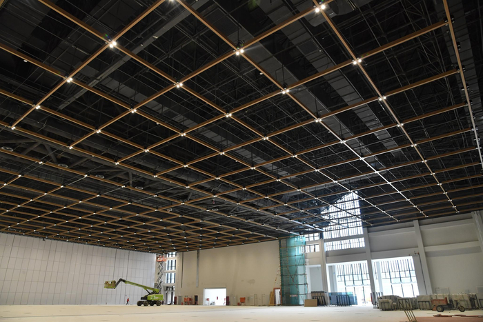 记者在主场馆内看到,目前,场馆内主体施工和室内外装修已完成,施工工人正在进行后续收尾。其中,承办开闭幕式的多功能厅面积约4200平方米,内部墙壁、灯等已安装完毕;主场馆展厅可利用移动隔断一分为二,目前,工人正在调整隔断位置。