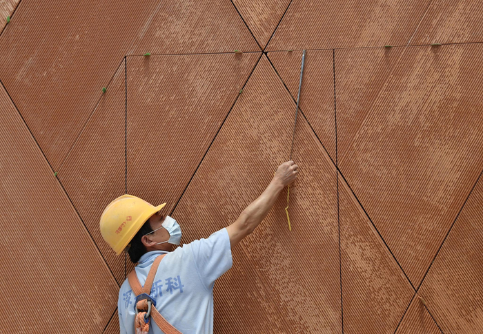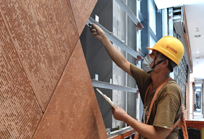工作人员在做主会场内部墙壁装饰。新京报记者 吴宁 摄