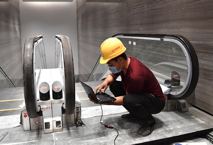 工作人员在调试电梯。新京报记者 吴宁 摄
