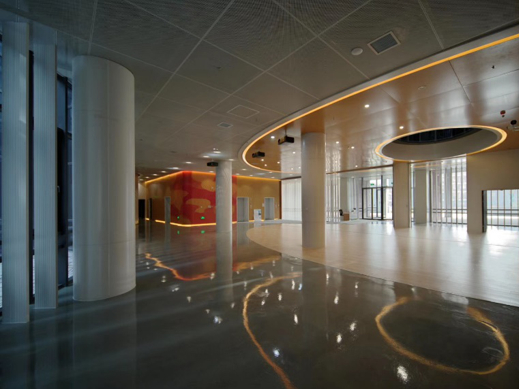 为了抵消地下水的浮力,在15000平方米的大楼底板下打有1000多根摩擦桩,灌注了30000吨水泥。大楼有地上四层,地下一层,目前正在安装按不同颜色分区的标识导向系统。