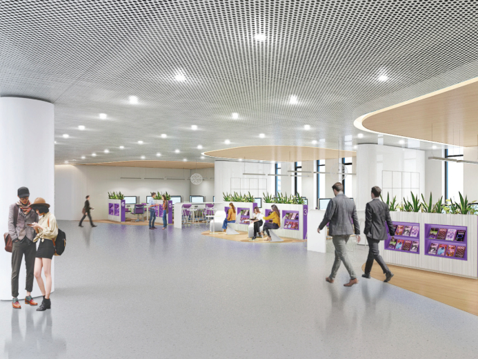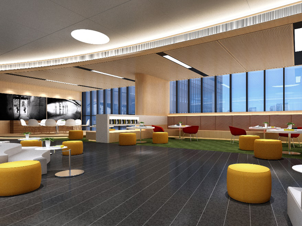 中庭是大楼的互动区,今后将以软装为主进行空间布置,设有公共会客室、茶歇咖啡角、走廊沙发等开放空间,力求创造教师之间、师生之间、以及学生之间交流合作的空间环境。大楼内部装修和外部景观都体现着人文关怀和平等合作的科学精神,通过透明玻璃、绿色植物、柔软地毯、和谐色彩、现代家具、装饰摆件等元素,营造出舒适的软环境。