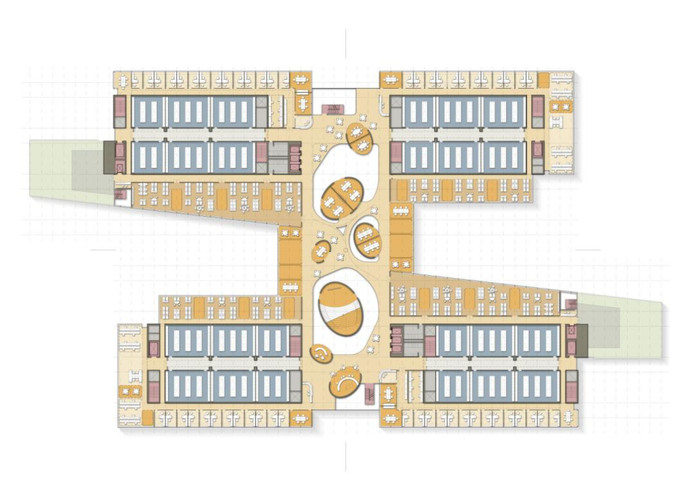 “工”字形的4个翼,每个翼设有12或14个教师办公室,学生工作室在另一侧,均为靠窗设计,中间则是实验室,便于不同学科师生之间的学术交流与合作,形成真正的“学术社区”。