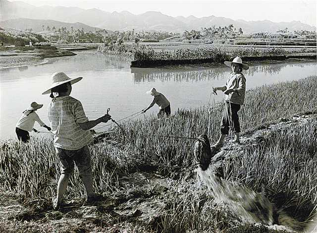 上世纪80年代改革开放初期,长寿县葛兰区农村农民顶着烈日,用各种工具引水抗旱。(本报资料图片)
