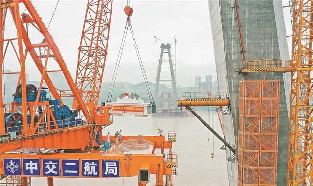 7月1日上午,白居寺长江大桥主桥钢桁梁首根杆件起吊,标志着世界最大跨度的公轨两用钢桁梁斜拉桥主桥开始上部结构施工。该项目利用BIM技术在计算机上建立模型,并推导出钢筋配料单、空间模板控制参数等,建造出84层楼高的桥塔。记者 罗斌 摄