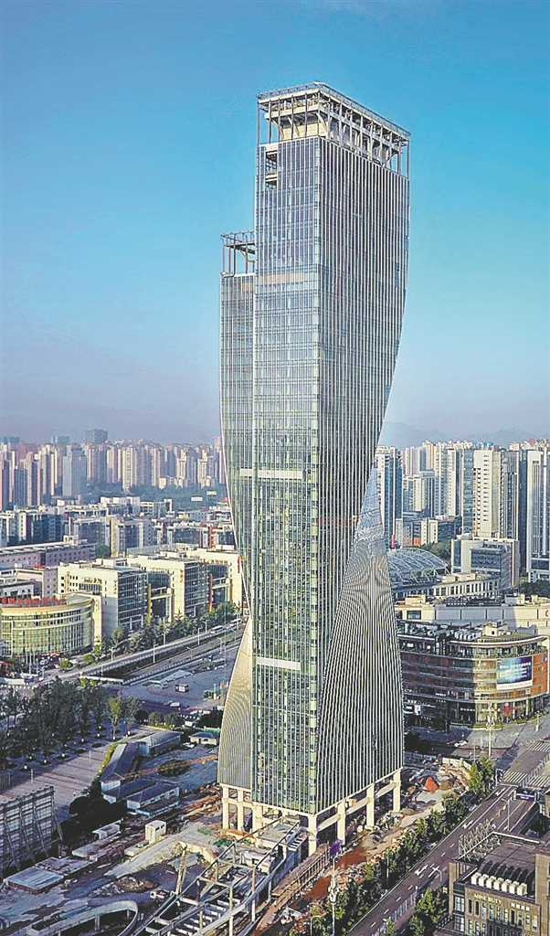 7月29日,两江数字经济产业园照母山片区,现代建筑太阳座扭了一个“小蛮腰”。该项目南立面单层扭拧角度最高达到了8.8度/层,远超同类项目。记者 张锦辉 摄
