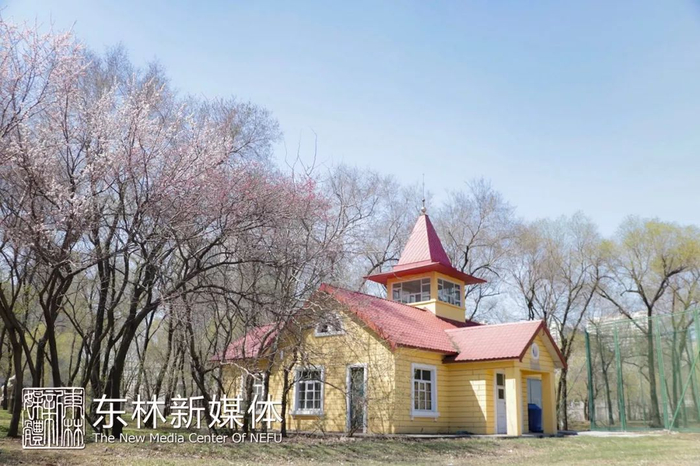 红房子,在树木花草之间,是拍照合影的绝佳之地。冬天红房子面前就是一片冰场,会出租冰刀,无论老少都常常在冰上翱翔。选择室外体育课的nefuer们也会在这里学习冰刀。