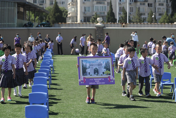9月1日,清华附小昌平学校天通苑校区,参加开学典礼的一年级新生。新京报记者 王贵彬 摄