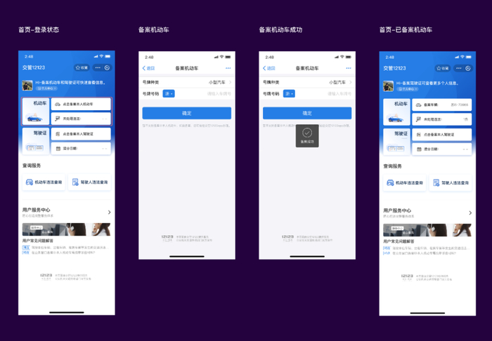 对于用户未备案机动车的,用户点击首页机动车区域或者用户在机动车信息页面点击“备案更多机动车”,进入备案机动车服务功能。用户选择号牌种类,录入号牌号码后即可完成备案操作。