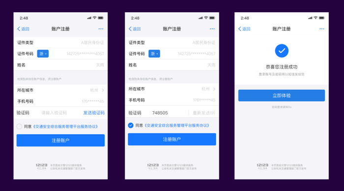 对未注册“交管12123”用户账号的用户,进入“交管12123”支付宝小程序后,点击首页上方的“请完善个人信息”,进入用户注册流程。用户选择驾驶证核发地或者机动车登记地作为注册城市,填写短信验证码完成注册。