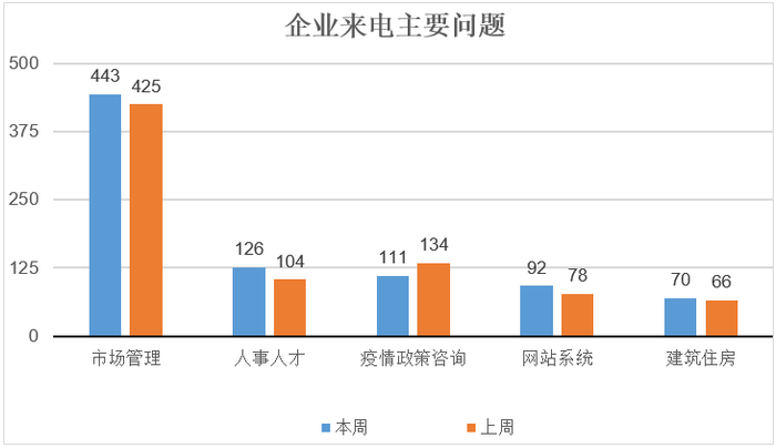 从企业来电类别看,咨询、反映的问题排位前五的是:市场管理问题,包括企业变更、注册设立、营业执照、食品管理、注销破产等;人事人才问题,包括社会保险、公积金和住房补贴、退休人员、待遇标准、工作居住证等;疫情政策咨询,包括房租减免、稳岗补贴、社保延期、其他政策咨询等;网站系统问题,e窗通及其他网站系统操作问题;建筑住房问题,包括建筑企业资质、住房管理、建筑工程、拆迁腾退、建筑业人员管理等。