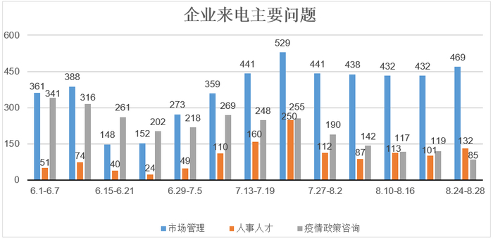 7月份以来,随着北京疫情防控形势向好,企业复工复产全面推进,企业常规性问题增多,尤其市场管理类问题来电较为突出,疫情相关来电呈下降趋势。8月第四周,企业人事人才类问题咨询量超过疫情政策咨询量,为6月以来首次反超。