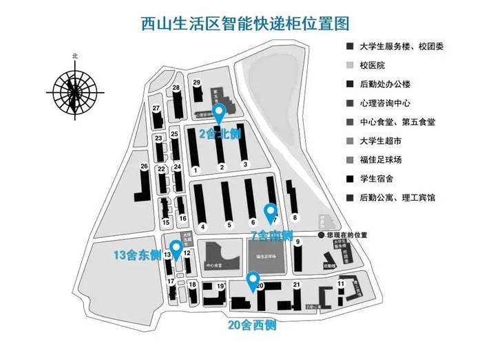 地址:理工西山第2学生宿舍北侧丰巢智能柜、第7学生宿舍南侧丰巢智能柜、第12学生宿舍前丰巢智能柜、第20学生宿舍旁丰巢智能柜。