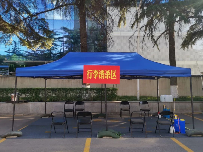 5.行李消杀:学生测温通过后,继续前行进入行李消杀区,配合工作人员对行李进行消杀,完成后再前往所在宿舍办理入住。