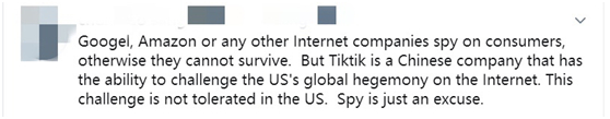 “谷歌、亚马逊或其他互联网公司都在监视消费者,否则他们将无法生存。但TikTok是一家有能力在互联网上挑战美国全球霸权的中国公司。而这种挑战在美国是不能容忍的。间谍只是个借口。”