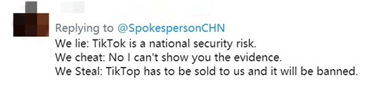 一名网友就点出:“(美国)所谓‘间谍’只是借口。TikTok是有能力在互联网上挑战美国全球霸权的中国公司,而这种挑战在美国是不能容忍的。”↓