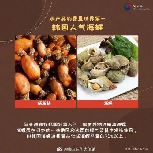 最后一个,柄海鞘和海螺。既然@韩国驻华大使馆 的描述中已经自相矛盾地承认这种海鲜很多地方也有,那我们就不拿出中国沿海地区都有的证据了。