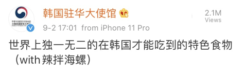 昨天(9月2日),@韩国驻华大使馆 在微博自豪开麦,宣传起了“世界上独一无二的在韩国才能吃到的特色食物”,看到这些排他性的宣传标语,网友好奇了,是什么吃的只有韩国才有呢?