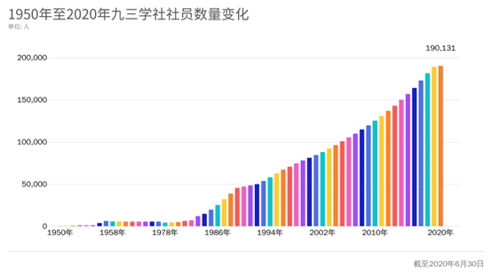 今天是中国抗日战争暨世界反法西斯战争胜利75周年纪念日,也是中国特色社会主义参政党之一的九三学社成立75周年纪念日。九三学社中央今天发布了一系列数据:截至2020年6月30日,九三学社共有190131名社员,省级组织30个,市级地方组织281个,县级地方组织29个,基层组织7326个。