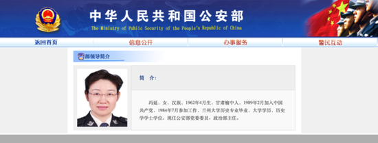 公安部官网显示,冯延,汉族,1962年4月生,甘肃榆中人,1989年2月加入中国共产党,1984年7月参加工作,兰州大学历史专业毕业,大学学历,历史学学士学位。