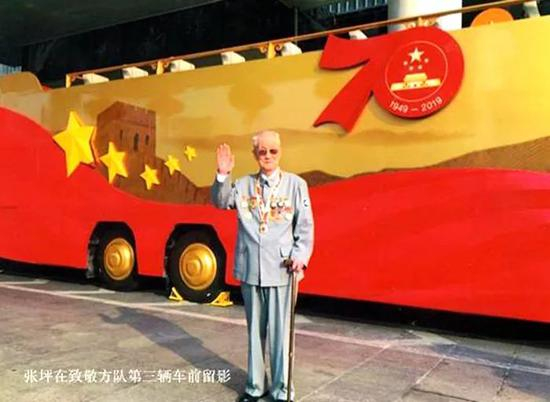 2019年中共中央、国务院、中央军委给张坪颁发了庆祝中华人民共和国成立70周年纪念章。当年10月1日,庆祝中华人民共和国成立70周年阅兵庆典在北京举行。庆典上,伴随一首《红旗颂》,21辆礼宾车组成的“致敬”方阵徐徐驶来,张坪就在第3辆车上。