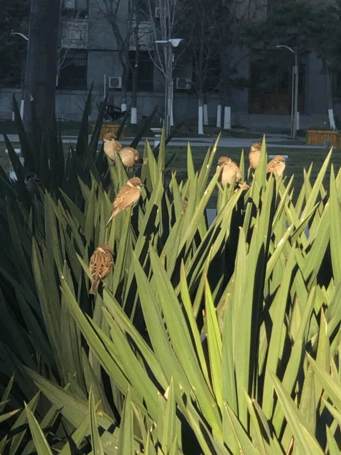 早晨第一缕阳光刚刚照射到京师广场,这时可以看到小麻雀扎堆休息哦~(祝大家早起顺利)