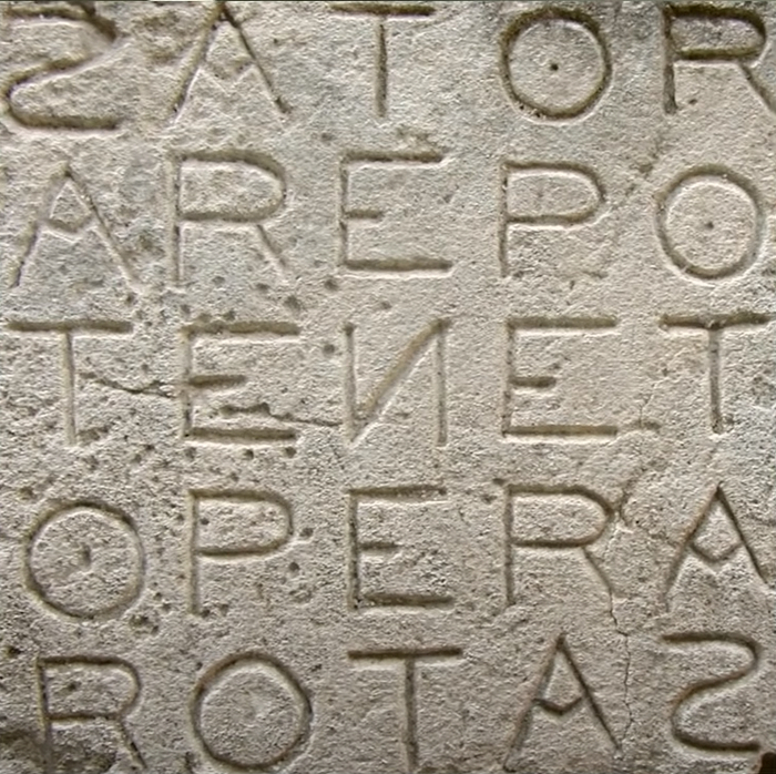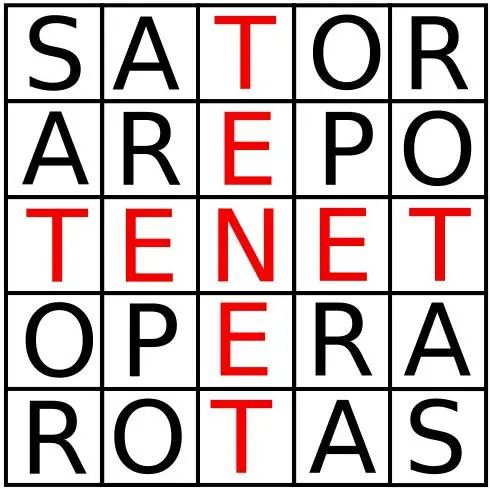 在庞贝古城的某处废墟中发现一块方碑,上面雕刻着五个由五个字母组成的拉丁语单词,它们构成回文诗句,表面含义是“农神(萨特)一直控制着时间之轮运转”,其实喻示影片的关键就是“时间逆转”。