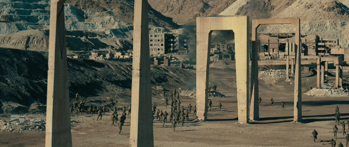 电影里总共有四座十字时间转门,它们分为红蓝两色,分别可以进行短暂的时间正逆进程。这些尺寸巨大的旋转门是机械化移动和铰接的神奇机械装置,这个装置非常大,里面甚至容得下汽车。