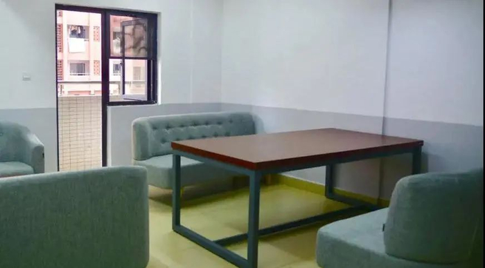 寝室内部是三室一厅公寓式布局,由三室一厅一卫一阳台构成。客厅有沙发茶几,是一个大寝同学们公共场所,可以在这里摆龙门阵或是开party,更有家的感觉。