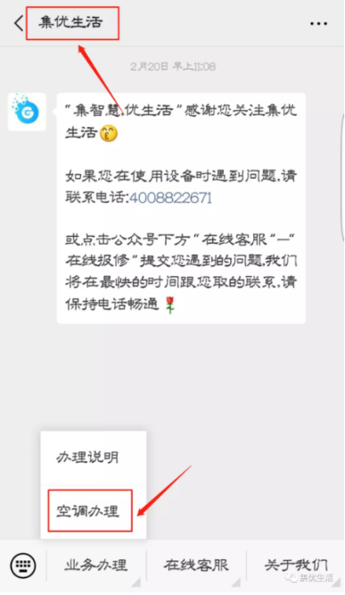 关注“集优生活”微信公众号,点击“业务办理”栏目,选择“空调租赁”按钮,按照提示操作完成。详细流程见“办理说明”栏目。