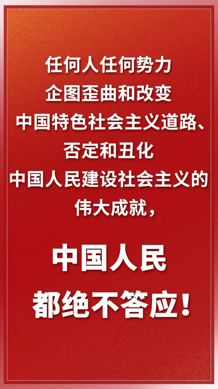 ——实现中华民族伟大复兴,必须坚持走中国特色社会主义道路。道路问题直接关系党和人民事业兴衰成败。中国特色社会主义道路是党和人民历经千辛万苦、克服千难万险取得的宝贵成果。中国特色社会主义道路,开拓于中国人民共同奋斗,扎根于中华大地,是给中国人民带来幸福安宁的正确道路。无论遇到什么风浪,在坚持中国特色社会主义道路这个根本问题上都要一以贯之,决不因各种杂音噪音而改弦更张。随着新时代坚持和发展中国特色社会主义的伟大实践不断向前,我们的道路必将越走越宽广,我们的制度必将越来越成熟。任何人任何势力企图歪曲和改变中国特色社会主义道路、否定和丑化中国人民建设社会主义的伟大成就,中国人民都绝不答应!