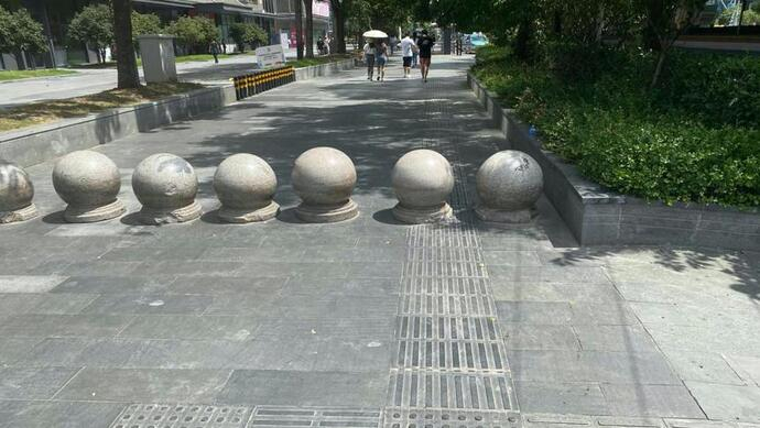 盲道被占用的情况并不少见,原因也各异。在商厦林立的五角场商圈,记者发现,广场西侧的人行道上,大段盲道被占用为非机动车停放区。此外,部分石墩被放置在了盲道上,行至此处的盲人存在被绊倒的安全隐患。