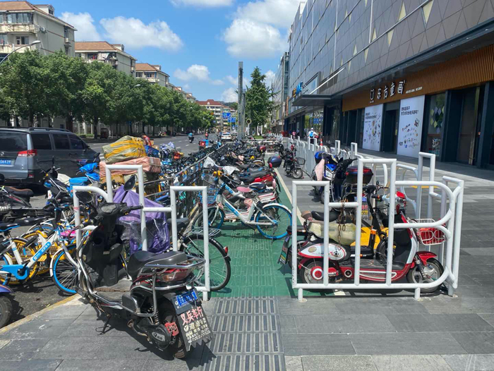 五角场万达广场前的盲道被占为非机动车停放点(郑朕 摄)