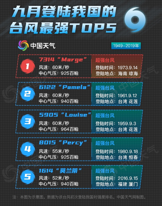 9月登陆我国最强的台风要数1973年第14号台风“Marge”,据中央气象台资料显示,台风“Marge”于9月14日凌晨登陆海南琼海,中心附近最大风速60米/秒,中心最低气压925百帕。据新华社消息,该台风共造成海南省926人死亡、1690人重伤、4470人轻伤,12.6万间房屋倒塌,损失惨重。