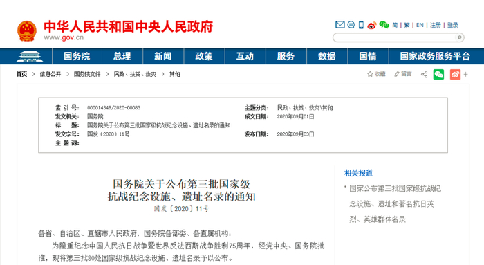 为隆重纪念中国人民抗日战争暨世界反法西斯战争胜利75周年,经党中央、国务院批准,现将第三批80处国家级抗战纪念设施、遗址名录予以公布。