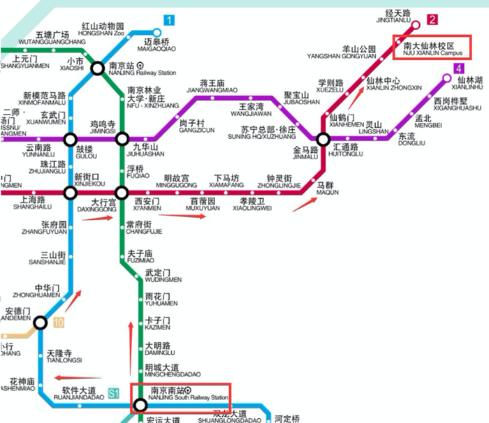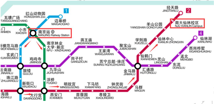 建议铁路来校同学购票时选择目的地为南京站或南京南站,下面分别介绍两个站点到达仙林校区的交通路线。