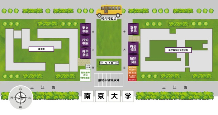 报到当天8:00-22:00 ,学校会在在南京站、南京南站设立新生接待站,方便各位新生直达学校。如果选择自行前往,亦可参考以下交通路线。