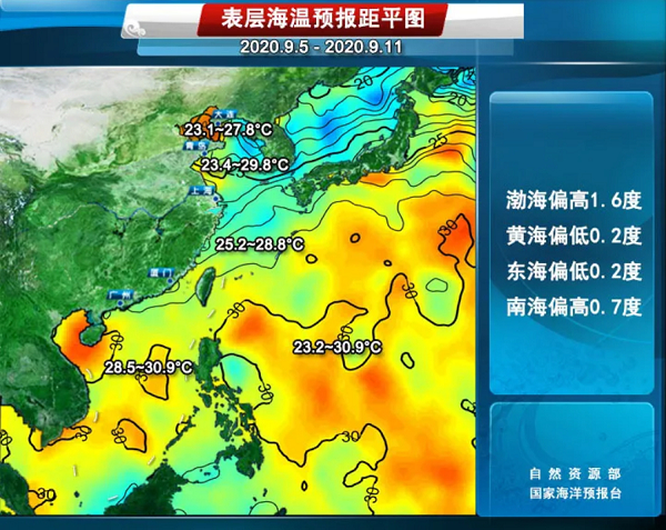 渤海为23.1到27.8度,比常年偏高1.6度左右;黄海为23.4到29.8度,比常年偏低0.2度左右;东海为25.2到28.8度,比常年偏低0.2度左右;南海为28.5到30.9度,比常年偏高0.7度左右;外缘海域为23.2到30.9度,比常年偏高0.7度左右。